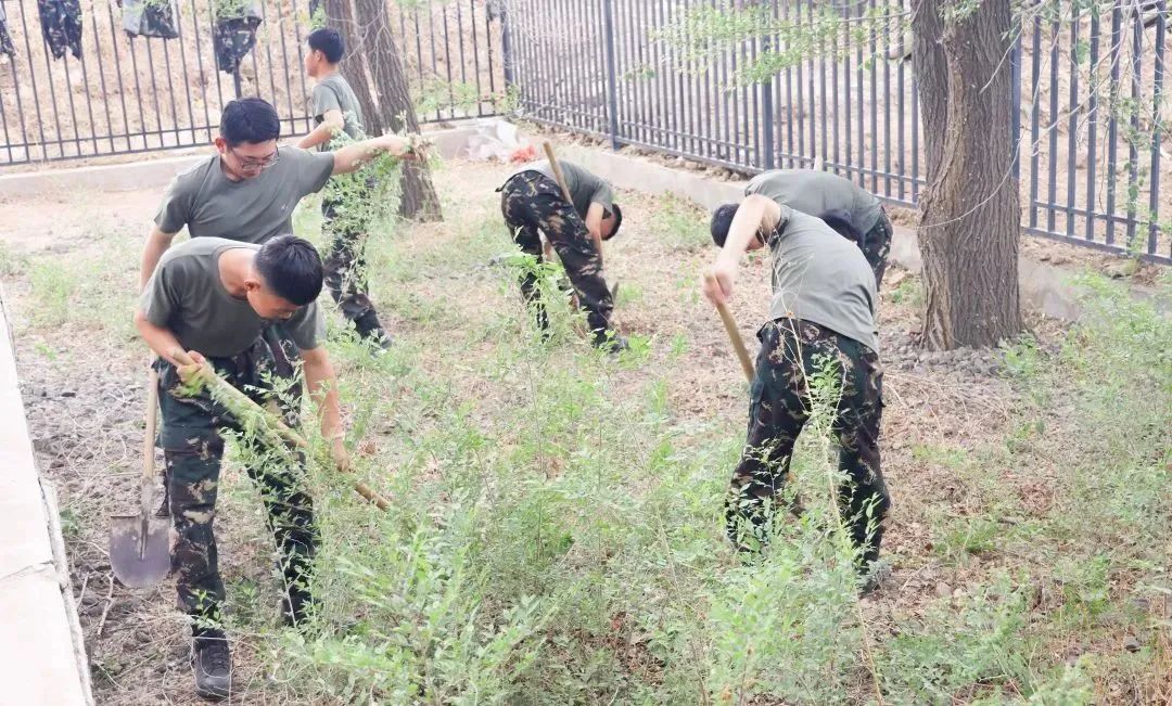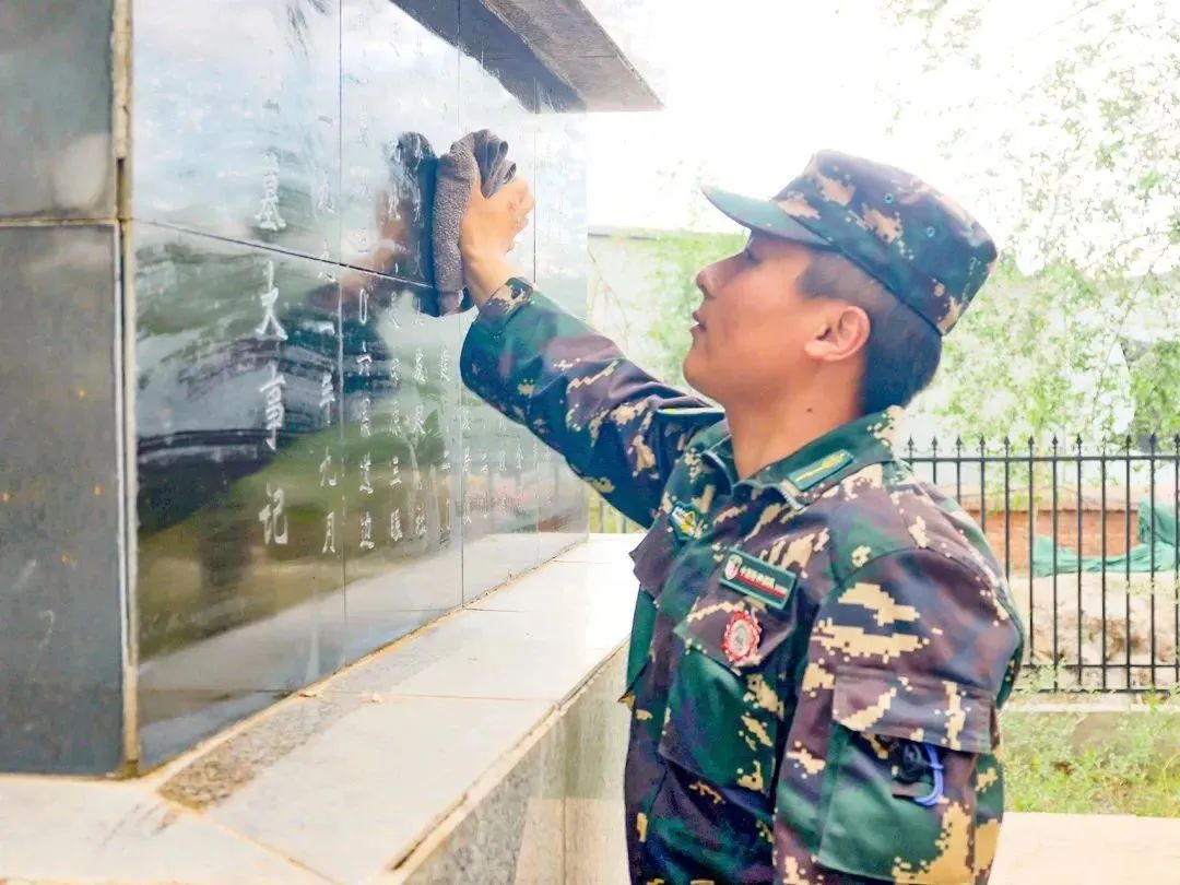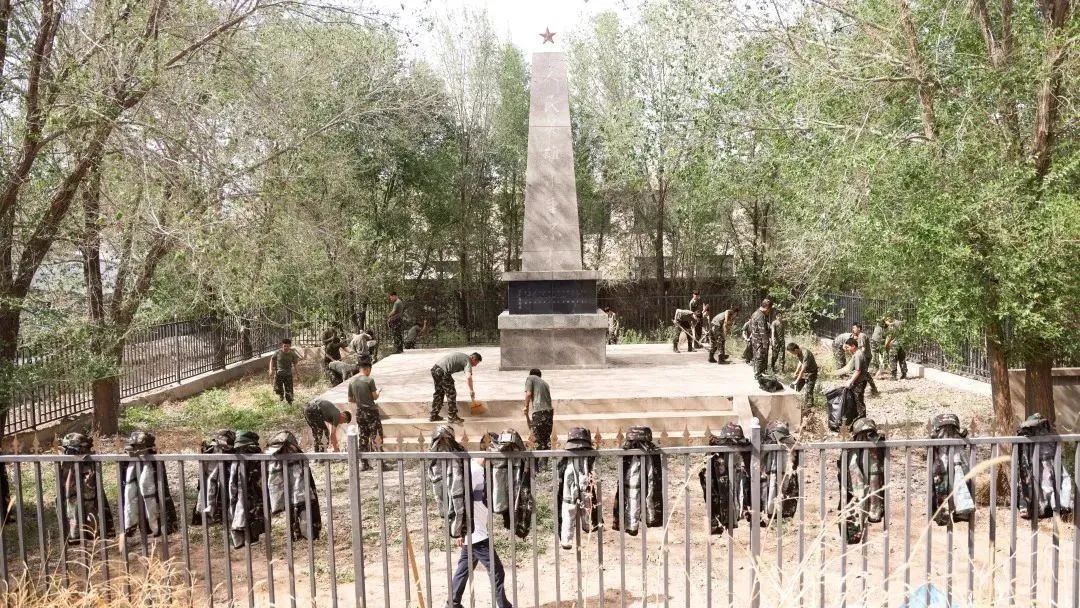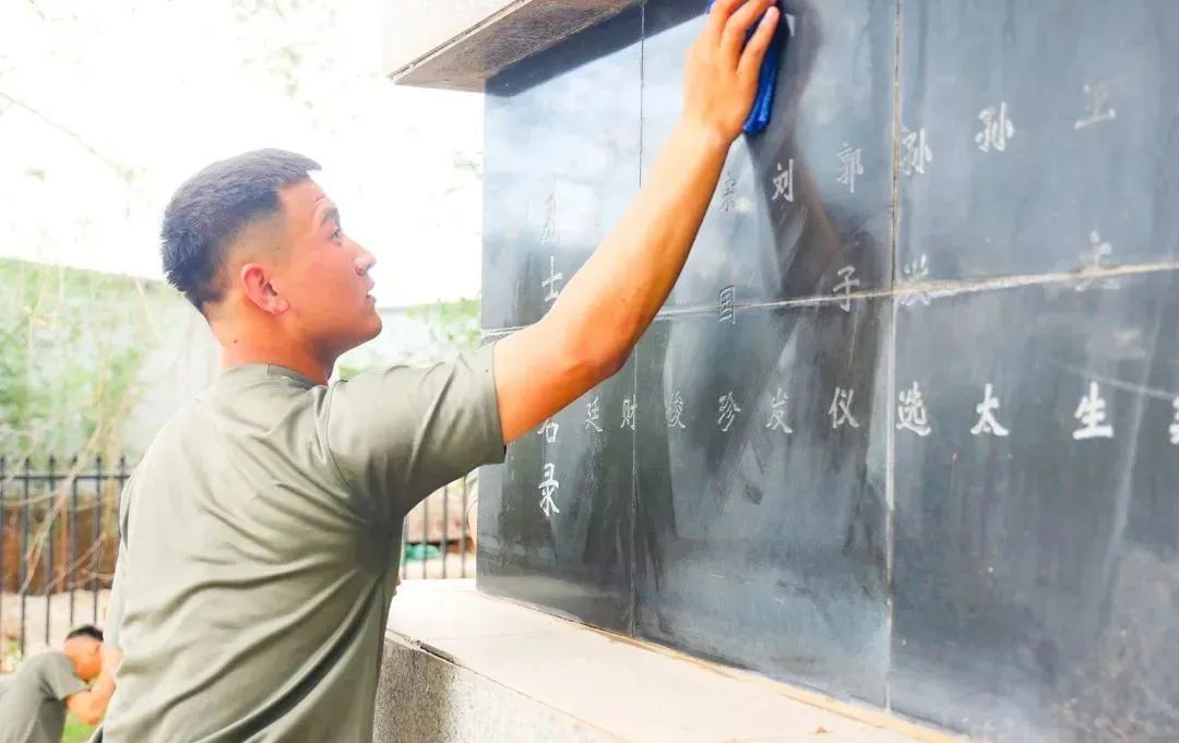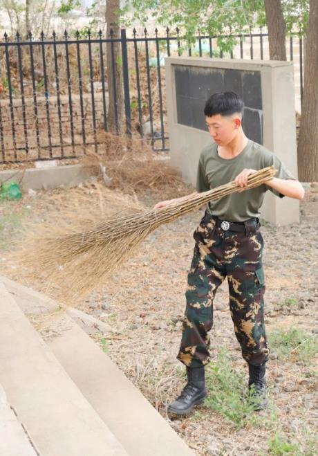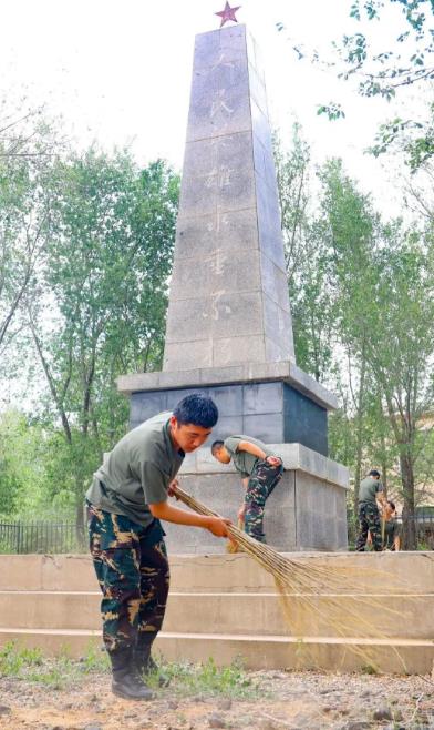 随后同学们在司全伟排长和赵伟军指员的带领下,开始打扫烈士陵园,同学们有的除草,有的清扫台阶,有的用干净的抹布擦拭着人民英雄纪念碑。很快烈士陵园被打扫的干干净净。